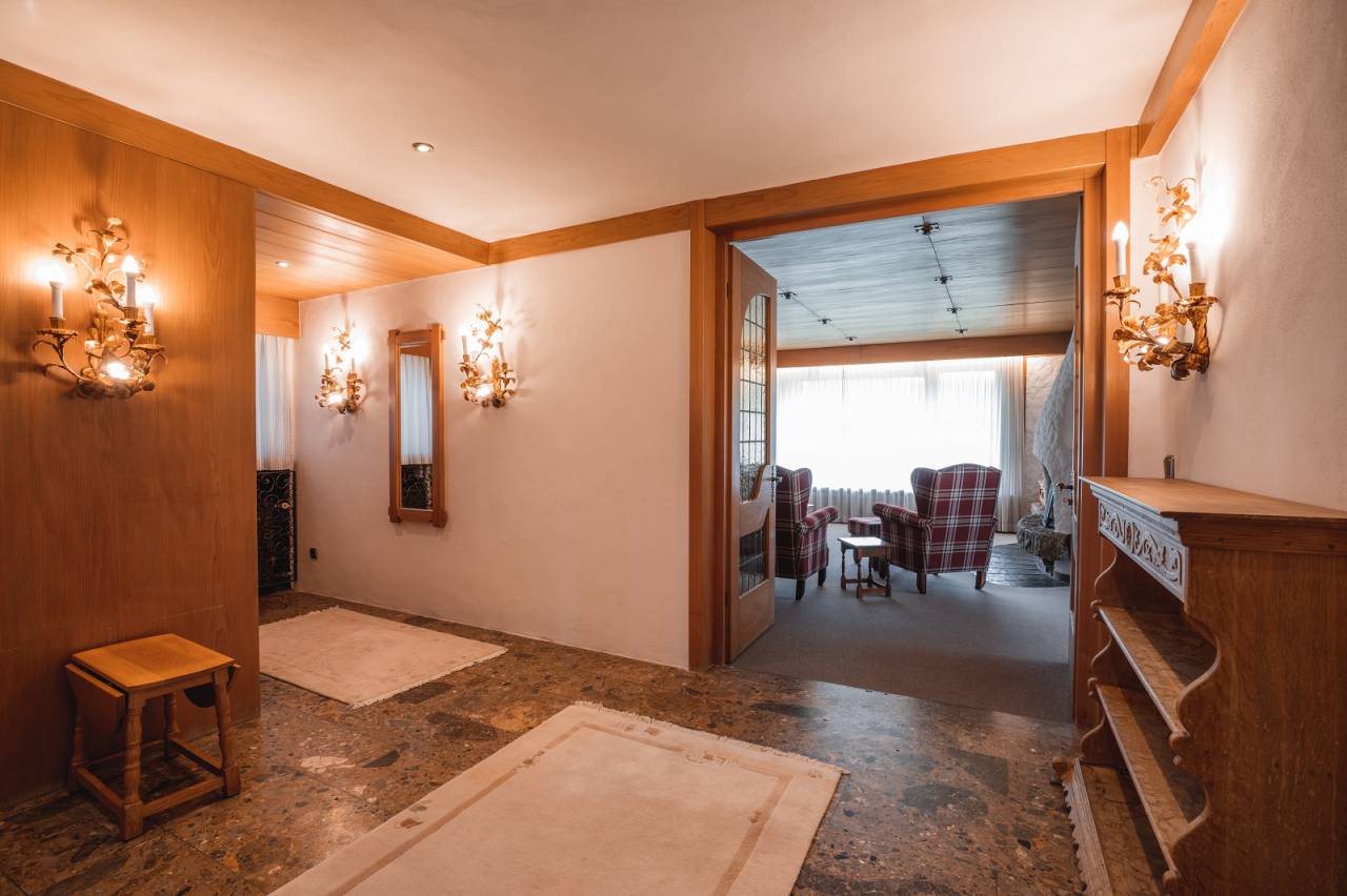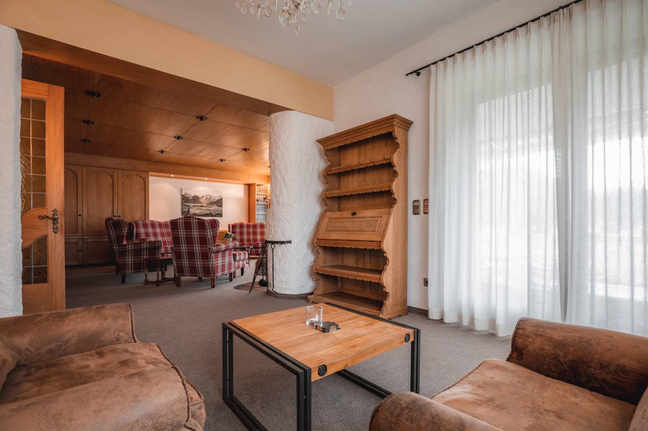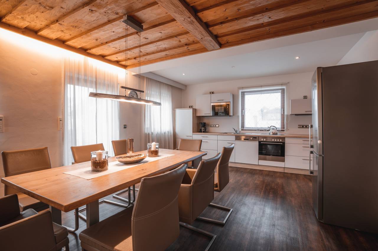 Im Erdgeschoss befinden sich die voll ausgestattete Wohnküche mit Ceranfeld-Herd, Backofen, Mikrowelle, Kühlschrank und mehr, in der Sie gemeinsam kochen, essen und genießen. Das Wohnzimmer beeindruckt auf 80 m² mit exklusiver Gastlichkeit, alpinem Ambiente und einem offenen Kamin. Das Highlight sind die sonnige Süd- und Westterrasse mit Garten. Hier genießen Sie den freien Blick auf die Berge und spüren ihre imposante, beinahe schon magische Kraft.