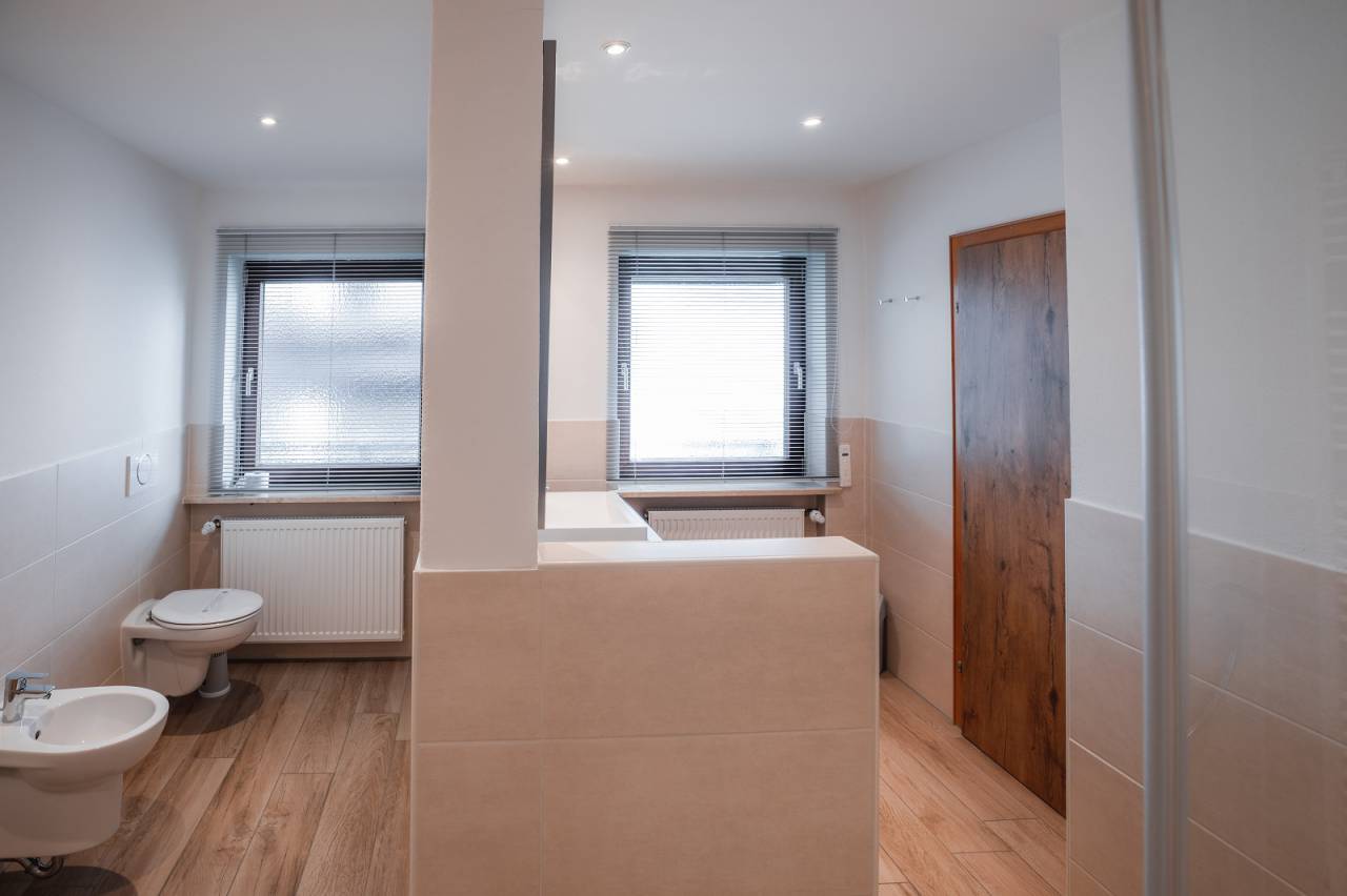 Im Obergeschoss befinden sich zwei große Schlafzimmer mit Doppelbetten und zwei weitere Schlafzimmer mit je einem Einzelbett (90x200), welche zum Doppelbett (160x200) erweitert werden können. Es stehen drei Badezimmer, ein besonders geräumiges mit Badewanne, Dusche und WC sowie zwei weitere Bäder jeweils mit Dusche und WC zur Verfügung.